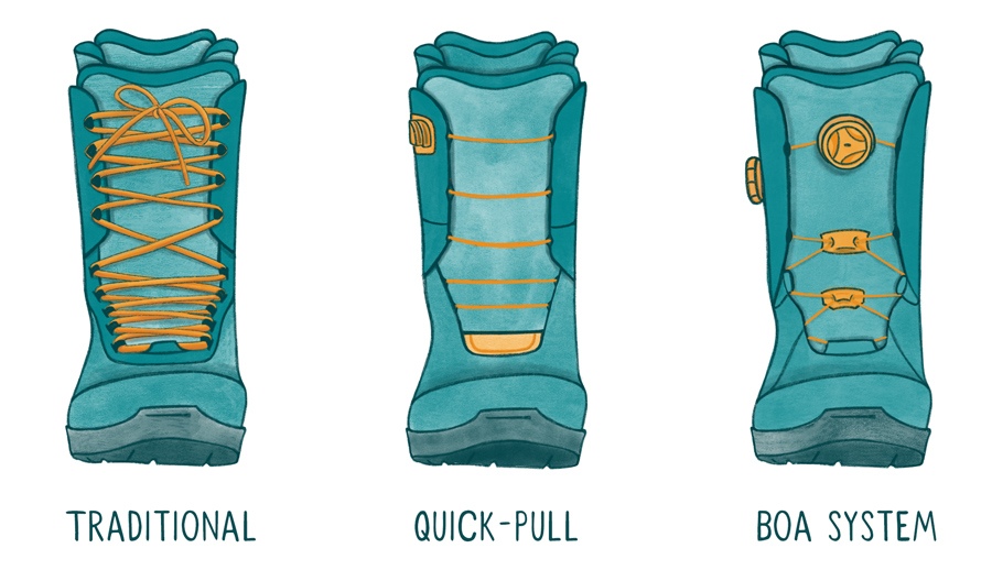 발 모양과 부츠 체결 방식을 고려해서 레이싱/보아 부츠 중에서 선택한다. 착용감에 포커스 한다면 레이싱 부츠를, 편의성에 집중한다면 보아 부츠를 권장한다.