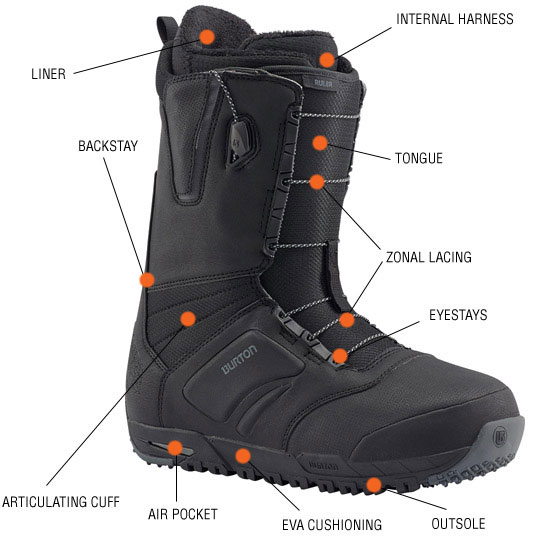 부츠를 고정해주는 레이스(Lace) 부분과, 레이스를 타이트하게 잡아주는 Eyestays 부분도 있다. 부츠 바닥면에는 무게와 흔들림을 완충해주는 Air pocket, 충격 흡수력을 높여주는 고무 폼 같은 소재의 Eva cushionning, 보드와 접촉하는 Outsole 등으로 구성된다.